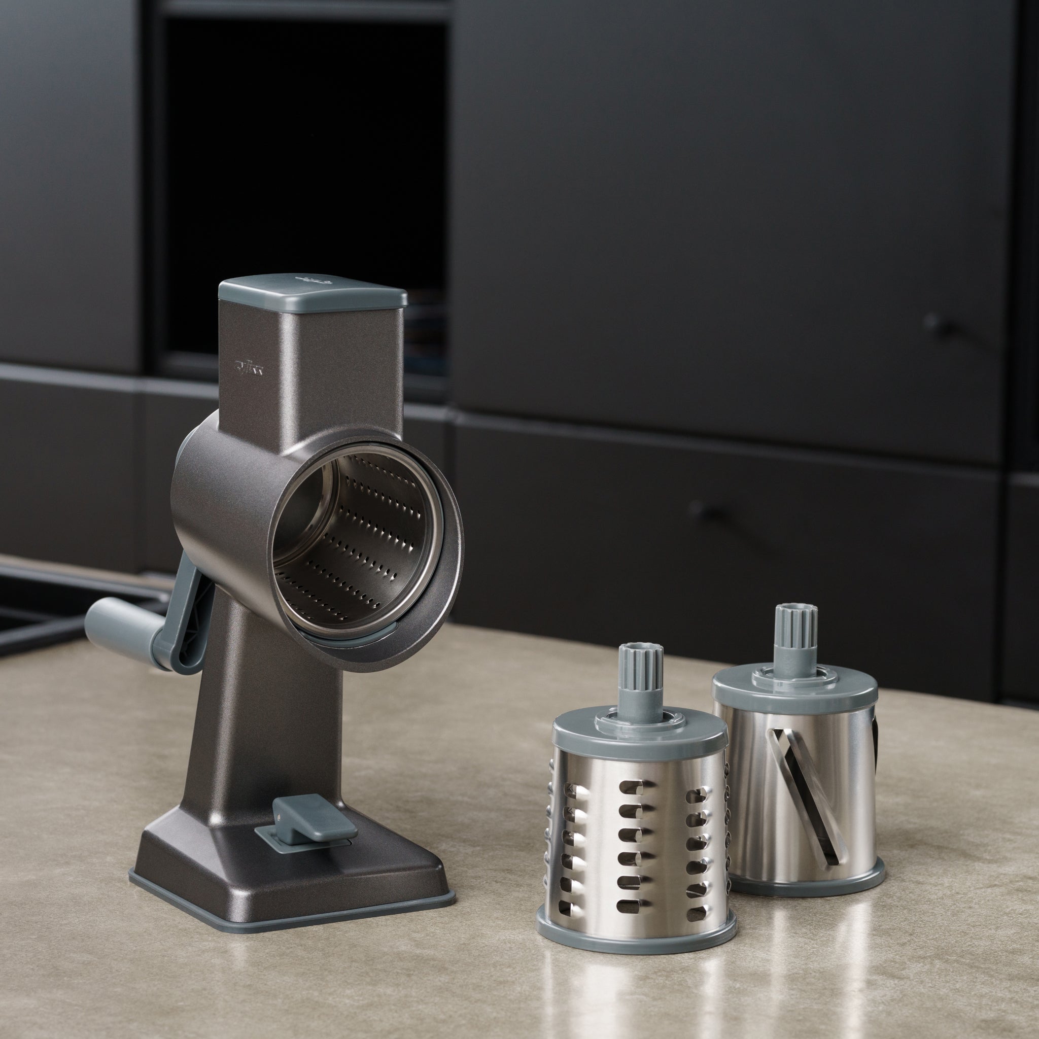 Ce set comprend trois tambours interchangeables en acier inoxydable (à tamis fin, à gros tamis et à trancher), parfaits pour le fromage, les légumes, les noix et bien plus encore. Des tambours supplémentaires sont disponibles séparément pour une plus grande polyvalence.