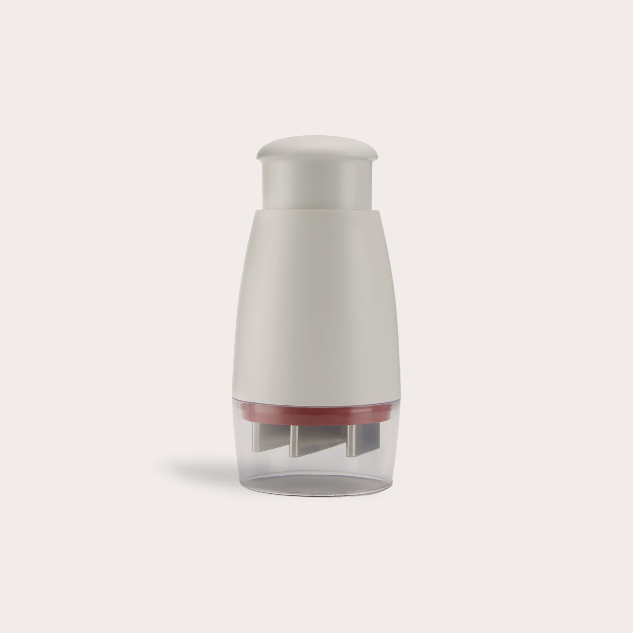 Le hachoir Zyliss Zick-Zick Classic coupe rapidement fruits et légumes sur une planche à découper. À chaque pression sur le poussoir, la lame se déploie, coupe les aliments et pivote pour se positionner. Le couvercle de la lame se retire pour un nettoyage facile. Le récipient inclus, avec son couvercle, sert également de boîte de conservation pour les restes d'ingrédients. La poignée se verrouille pour un rangement compact et aisé dans les placards ou tiroirs de la cuisine. Ce hachoir est un appareil pratique, esthétique et innovant qui vous fera gagner un temps précieux !