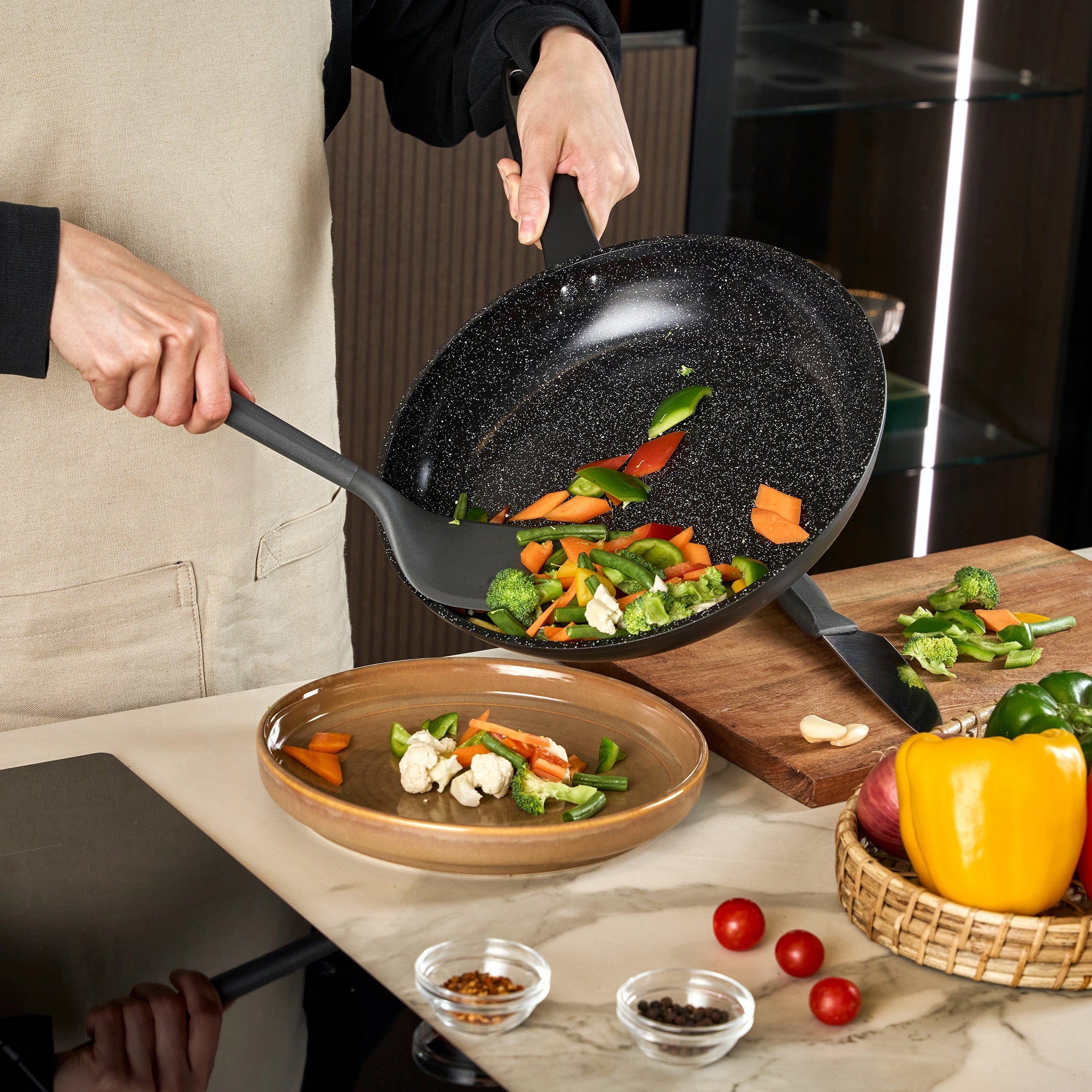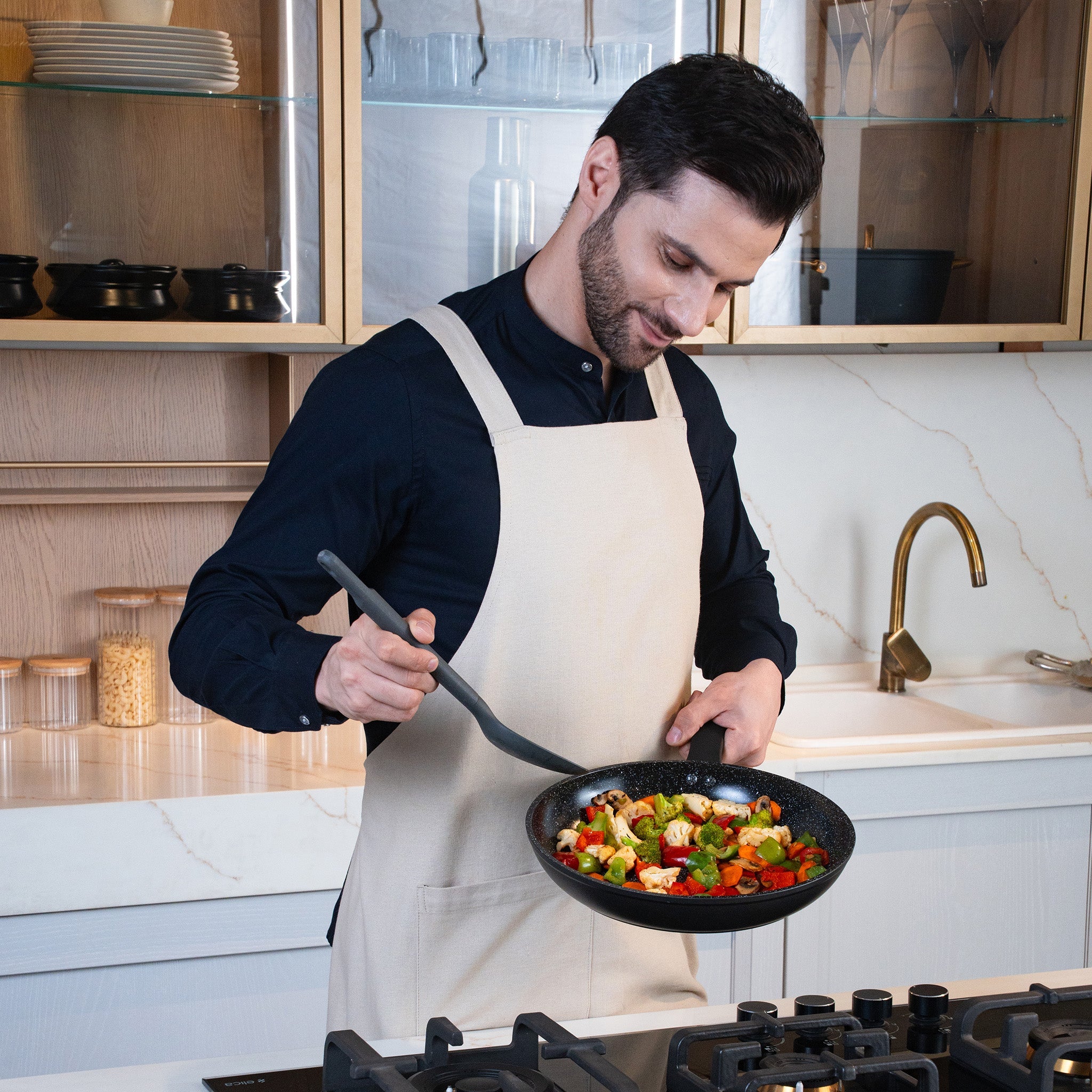 Le corps en aluminium forgé assure une répartition rapide et homogène de la chaleur, tandis que le fond en acier inoxydable à induction rend ces poêles compatibles avec tous les types de plaques de cuisson, y compris l'induction. Une poignée ergonomique douce au toucher offre confort et maîtrise, les rendant idéales pour un usage quotidien.