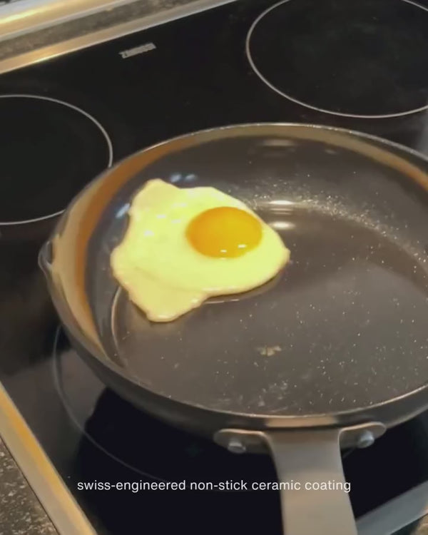 Fabriquée en aluminium recyclé avec un revêtement antiadhésif en céramique suisse, idéale pour sauter sans huile et pour la cuisson lente.