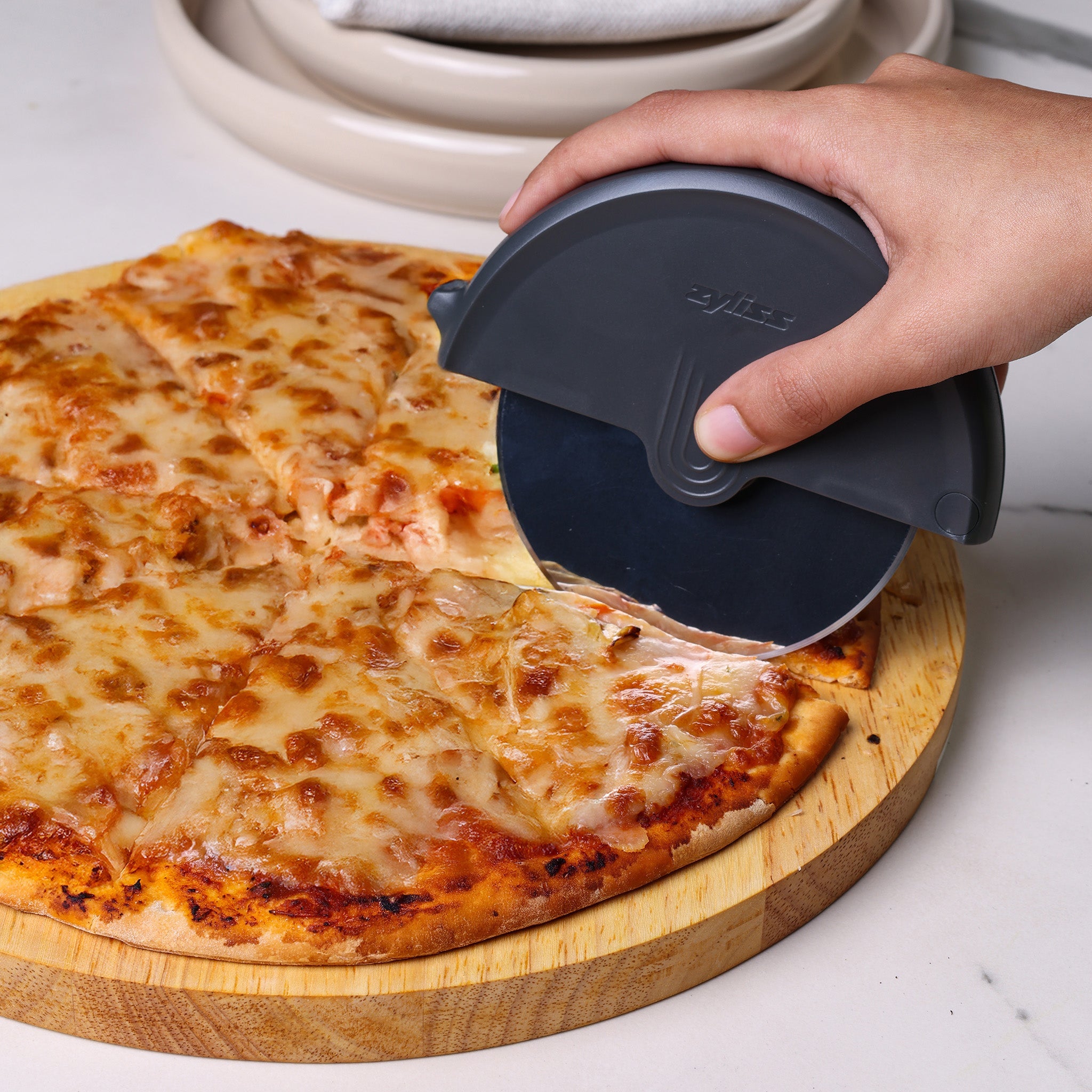 La roulette à pizza Zyliss est conçue pour une découpe nette et précise à chaque utilisation. Dotée d'une lame tranchante en acier inoxydable, elle coupe sans effort les pâtes à pizza, qu'elles soient épaisses ou fines, ainsi que les pains plats, les pâtisseries et les pâtes à pizza. Sa poignée ergonomique offre une prise en main confortable, aussi bien pour les droitiers que pour les gauchers, tandis que la lame amovible permet un nettoyage facile et sûr. Conçue pour un usage quotidien, elle passe au lave-vaisselle (sauf le protège-lame) et se range facilement dans un tiroir de cuisine grâce à sa conception compacte. La poignée est fabriquée à partir de paille de blé contenant 20 % de plastique réduit, offrant ainsi un design durable qui diminue l'utilisation de plastique sans compromettre la durabilité.