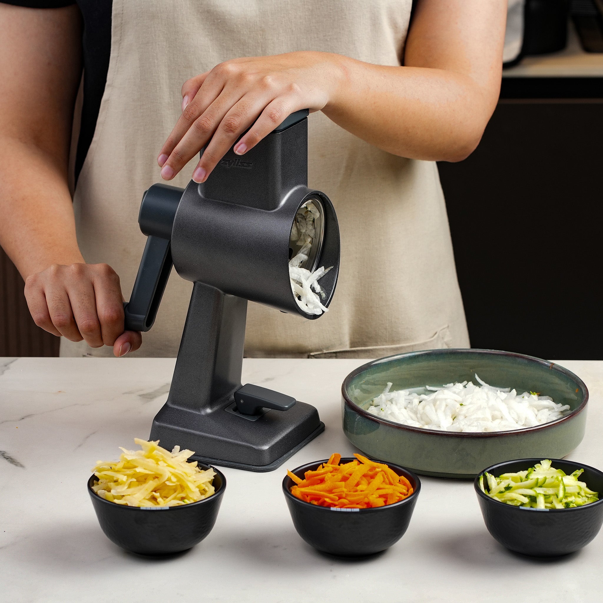 La nouvelle râpe à tambour unique est compacte et fiable. Dotée d'un tambour en acier inoxydable à gros grain, elle est idéale pour le fromage, les légumes, les noix ou le chocolat. Contrairement au modèle complet à plusieurs tambours, cette version simplifiée facilite son utilisation quotidienne. Fabriquée avec un corps robuste en fonte d'aluminium, une poignée ergonomique et une base à ventouse stable, elle passe au lave-vaisselle et est conçue pour durer.