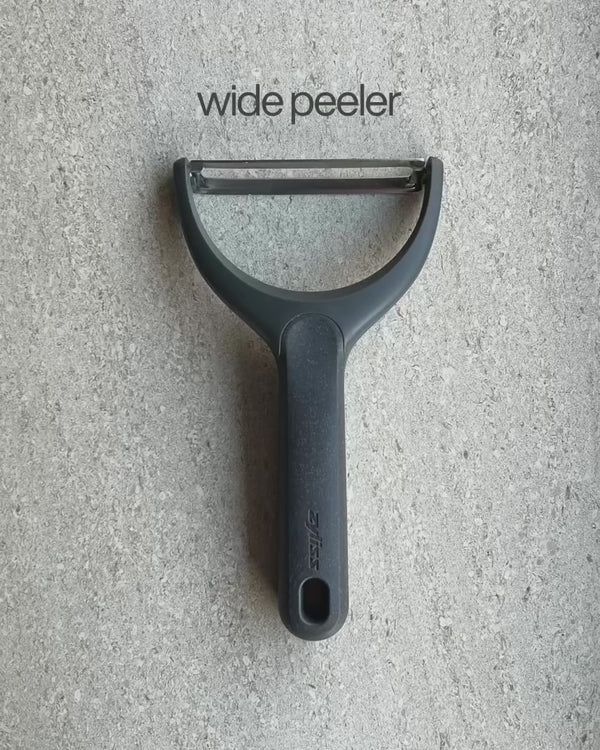 Éplucheur large conçu pour les gros fruits et légumes, avec une prise en main facile et un tranchant efficace.