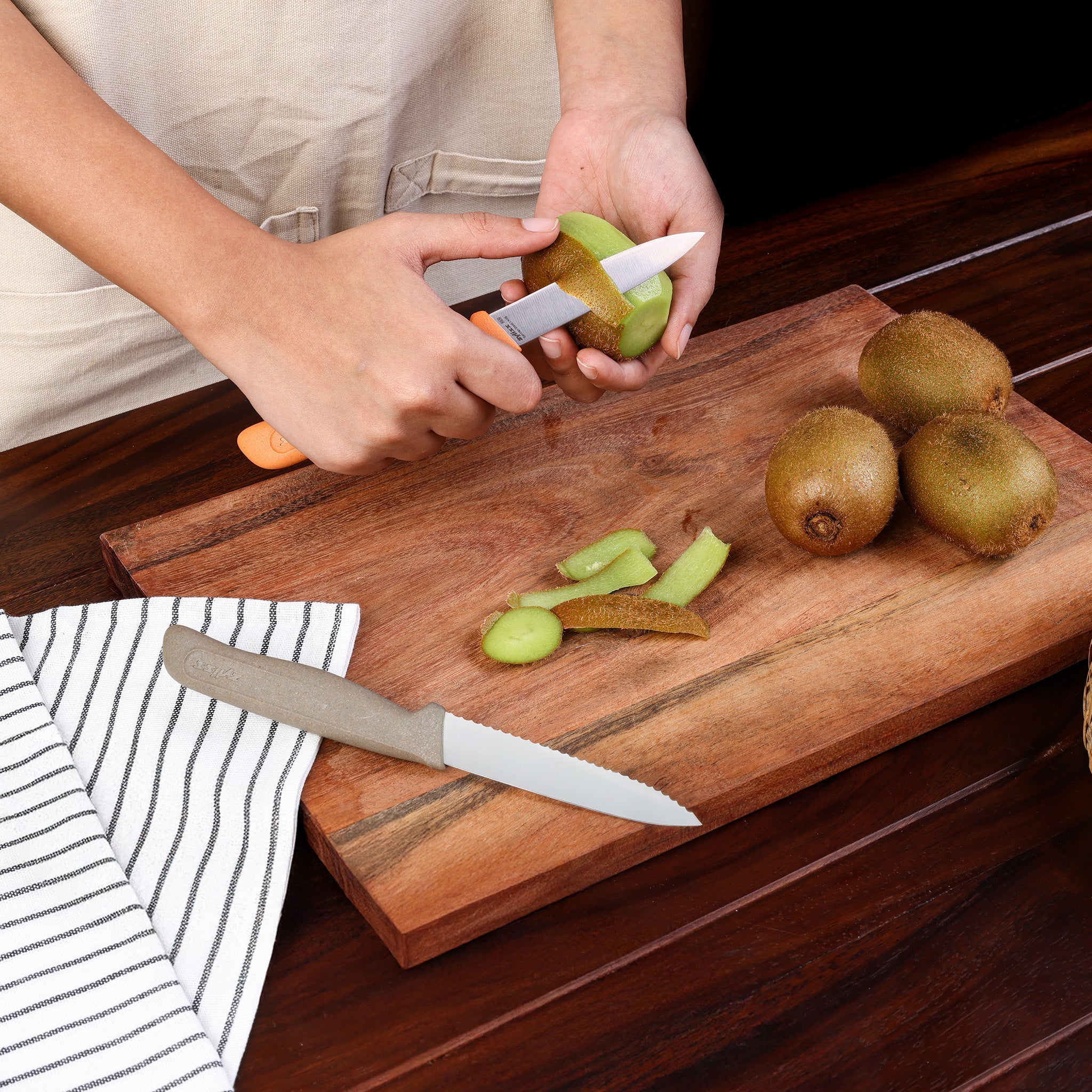 Cet ensemble polyvalent comprend un couteau d'office dentelé de 100 mm (4 po), idéal pour trancher les fruits et légumes à peau dure, et un couteau d'office de 90 mm (3 ½ po), parfait pour peler et couper avec précision. Les deux couteaux sont munis d'un protège-lame transparent pour un rangement et une protection optimaux.