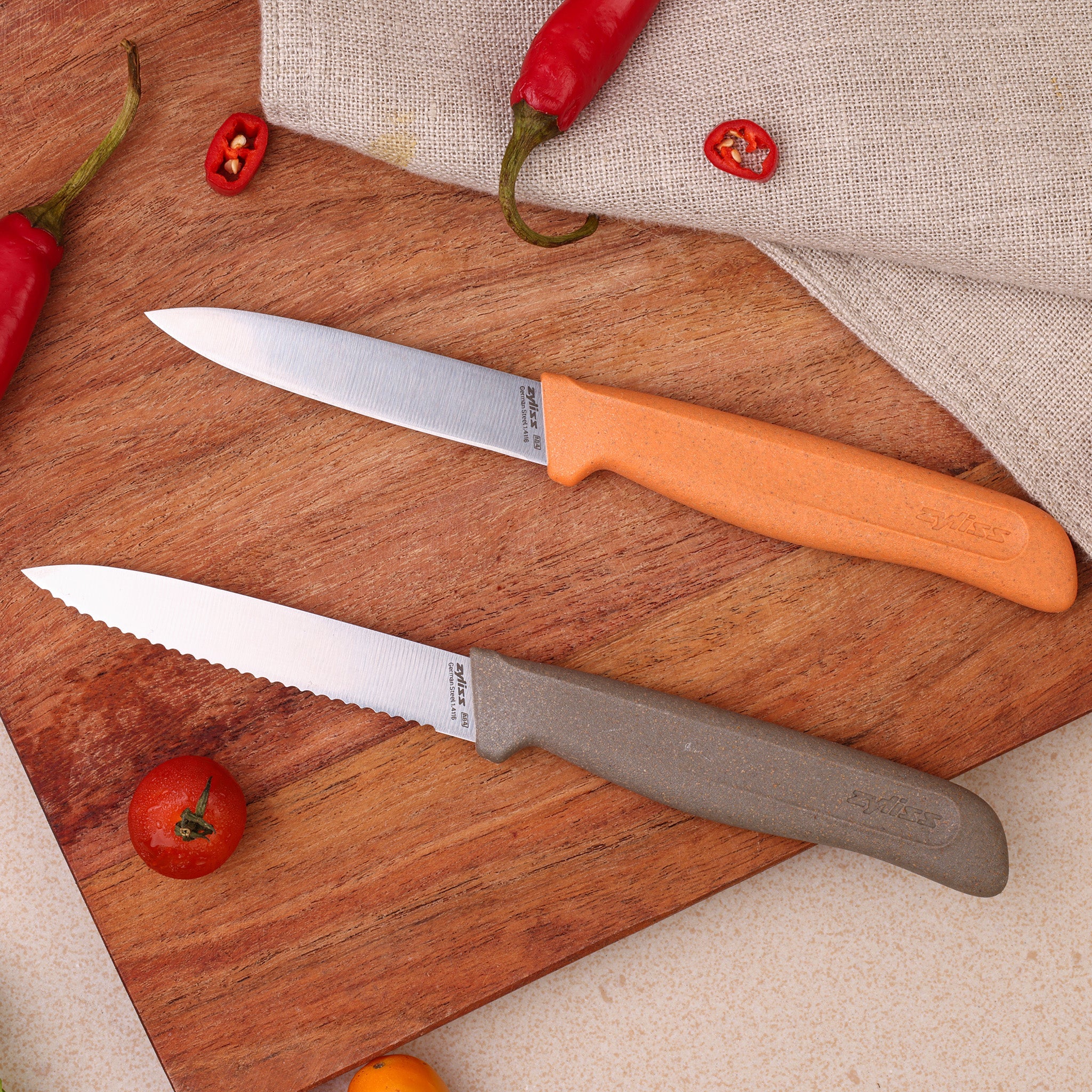 • The Zyliss 2 Piece Knife Set features a serrated paring knife with a gray handle and a precision peeling knife with an orange handle, displayed side by side on a light background.