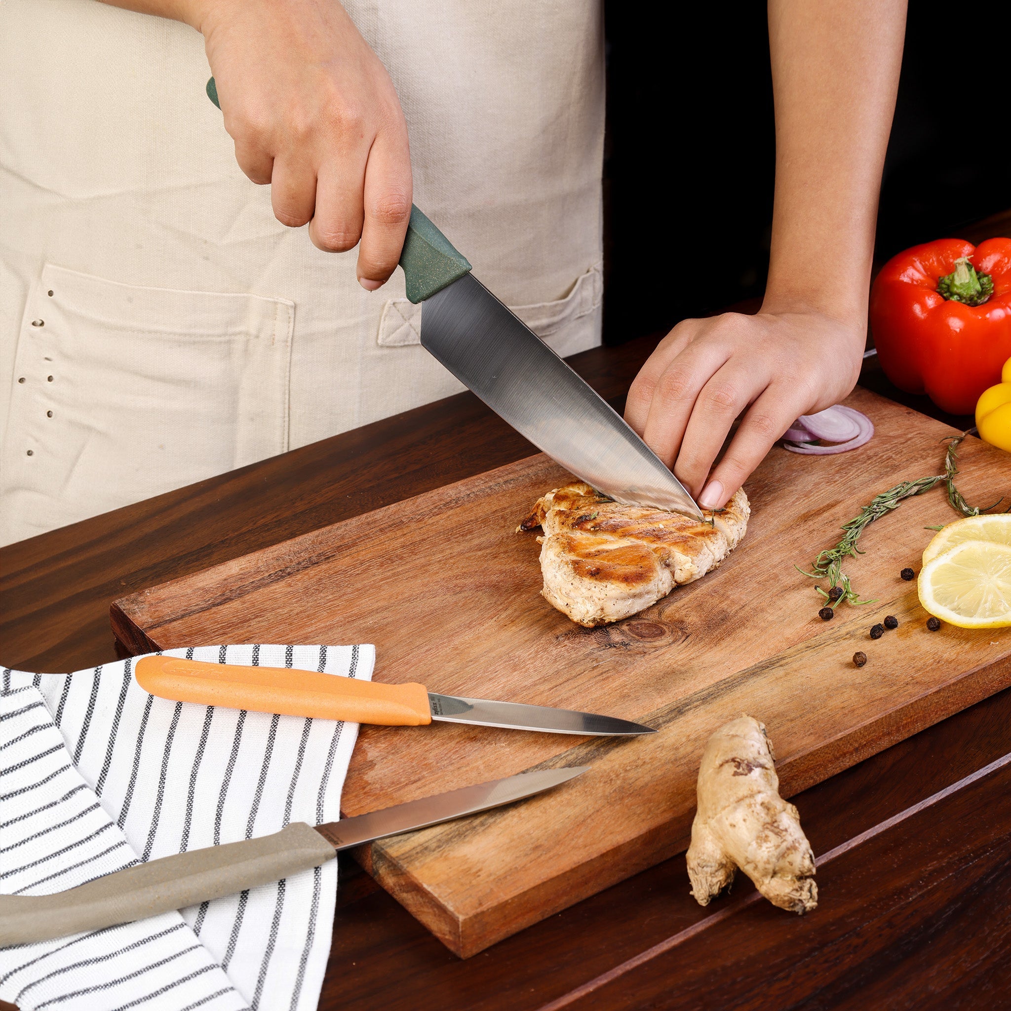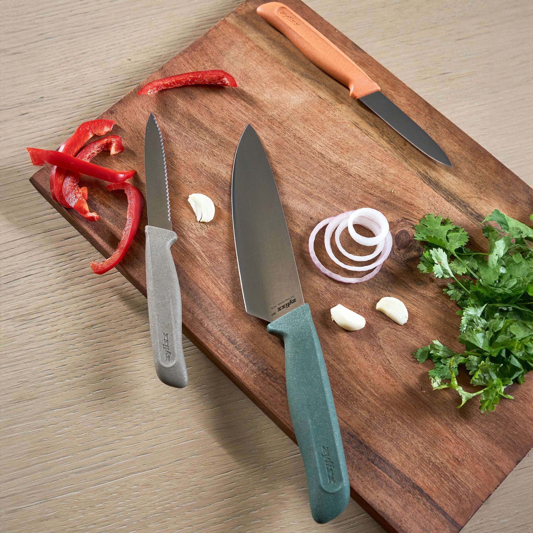 Cet ensemble de cuisine indispensable comprend un couteau de chef de 180 mm (7 ¼") pour hacher et trancher en toute simplicité, un couteau d'office dentelé de 100 mm (4") pour couper les fruits et légumes à peau dure, et un couteau d'office de 90 mm (3 ½") pour les tâches de précision. Conçu pour un usage quotidien, cet ensemble allie précision, durabilité et praticité.