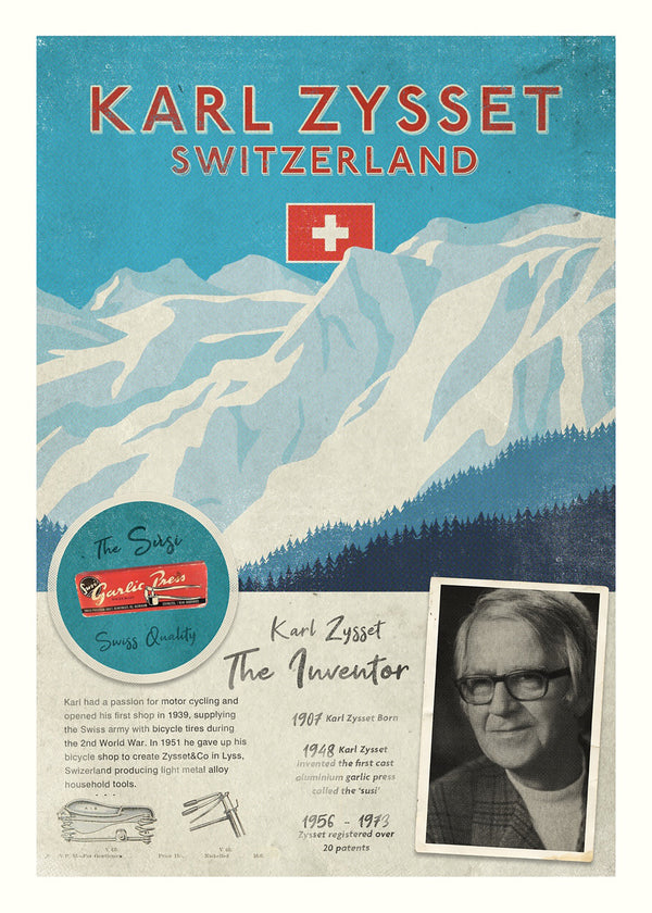 Après la guerre, en 1948, Karl fit une découverte capitale : un outil de cuisine révolutionnaire inspiré du mécanisme d’un frein de vélo. Dès 1951, il se consacra pleinement à l’innovation et fonda Zyliss, un nom dérivé de Zysset et de sa ville natale, Lyss.