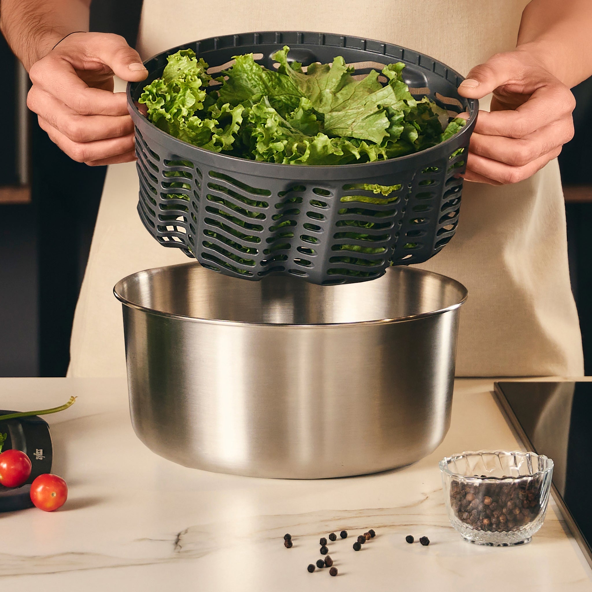 Préparez sans effort une salade fraîche et croquante en quelques secondes grâce à l'essoreuse à salade Zyliss Easy Spin, lauréate du prestigieux prix Red Dot Award du design produit 2025. Dotée de la technologie AquaVent™, son panier innovant évacue rapidement l'excès d'eau pour un résultat parfait. Le modèle plus petit (23 cm) convient pour 2 à 4 portions, tandis que le plus grand (27 cm) peut accueillir 4 à 6 portions de salade ou de légumes.
