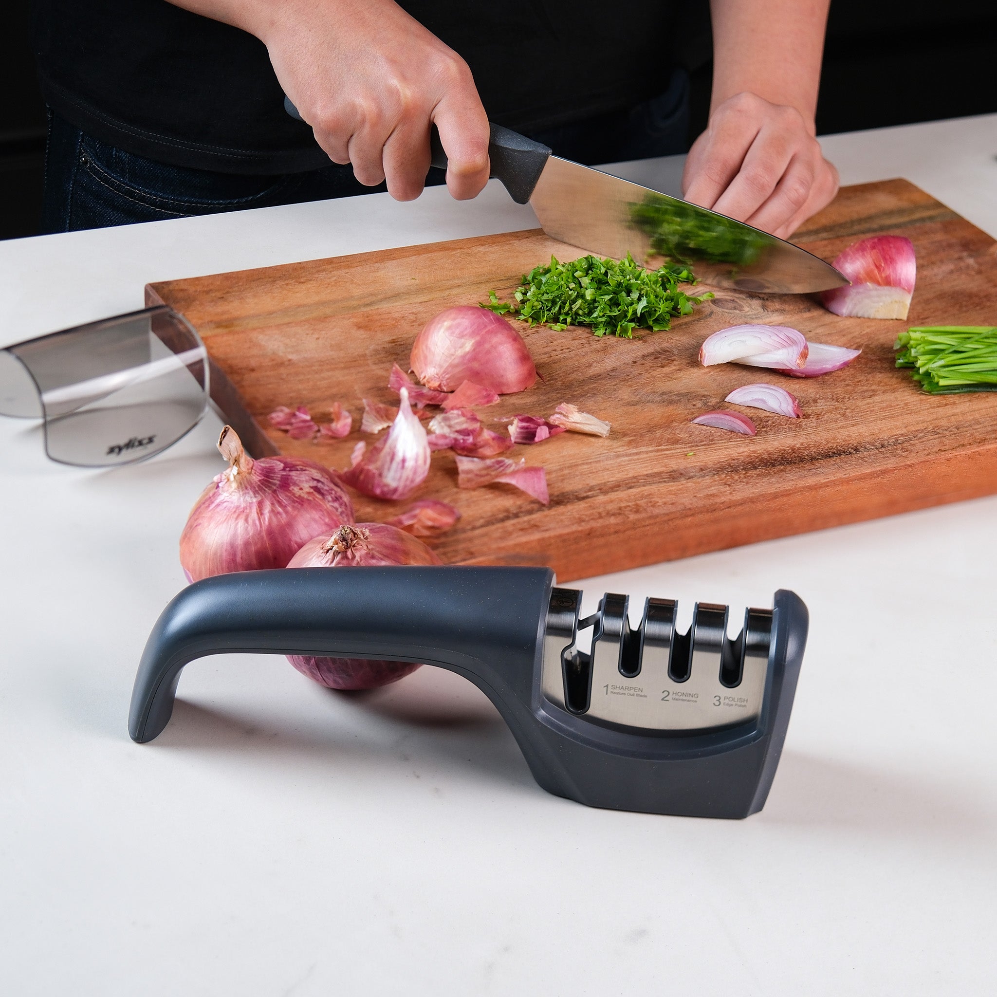 • A person maintains kitchen blades by sharpening a knife with the Zyliss Knife Sharpener on a wooden surface, keeping the sharpener cover nearby for safety and cleanliness.