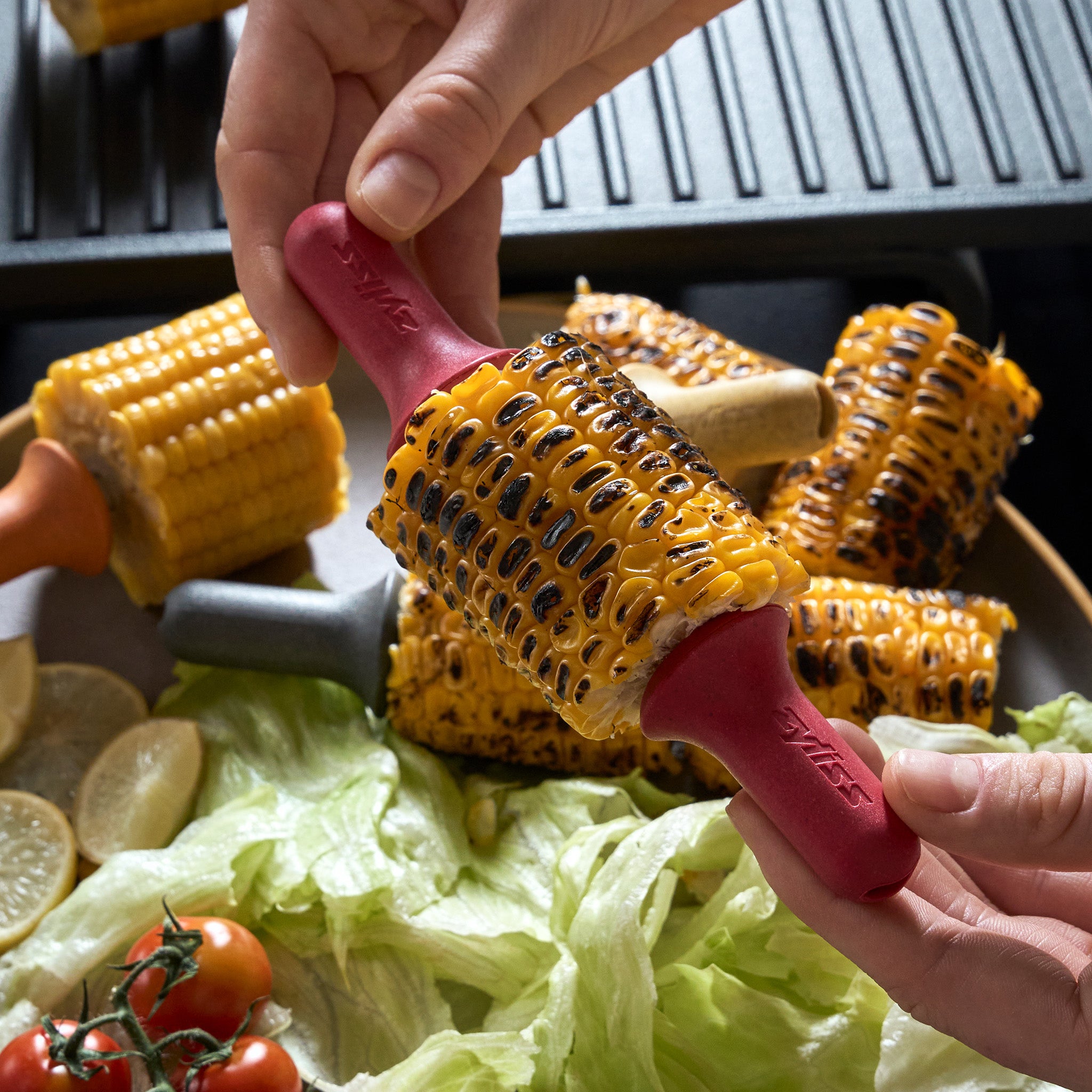 • The Zyliss Corn Holders 4 Piece Set features cylindrical holders with ergonomic handles in yellow, black, orange, and red, each with a notch at one end, shown vertically on a light background.