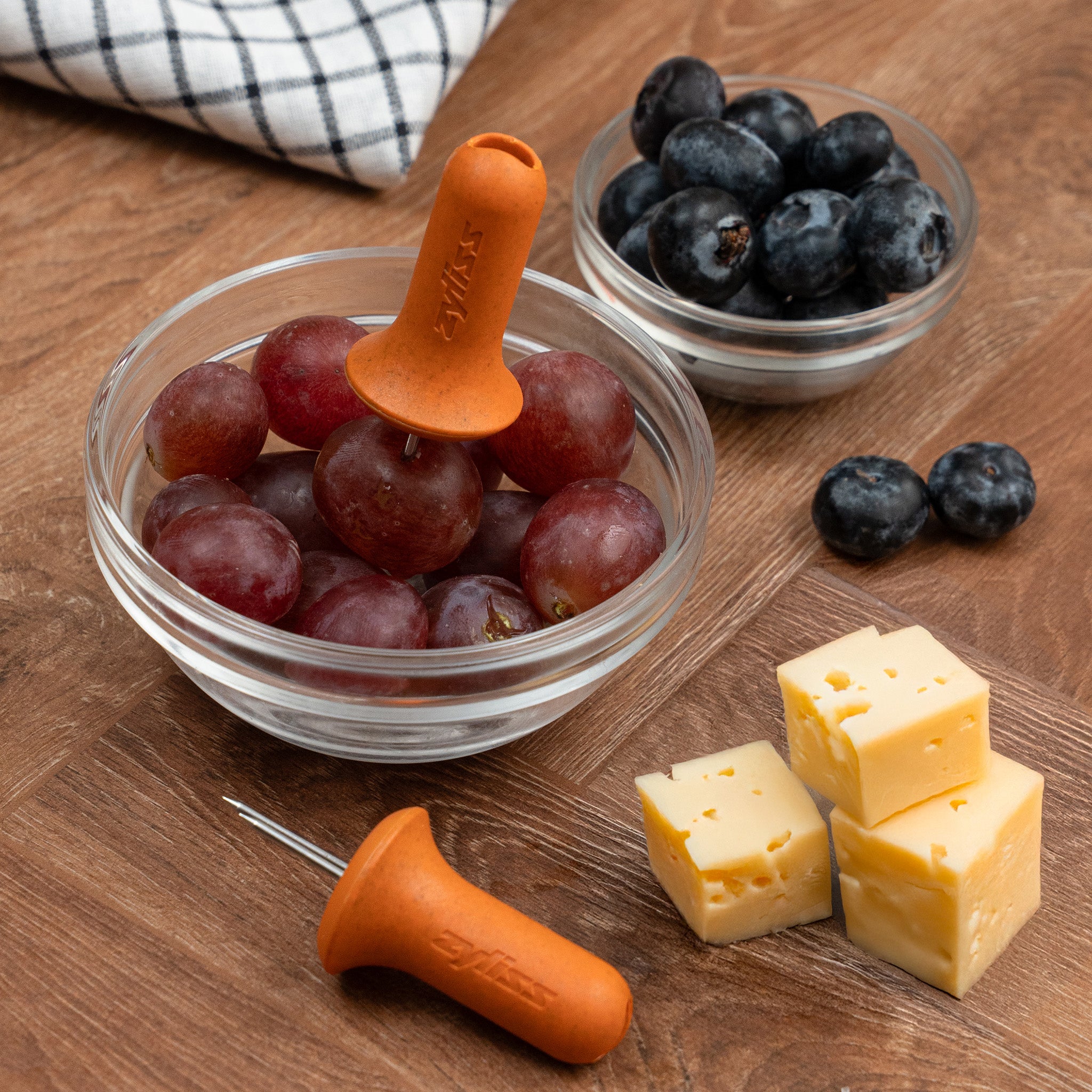 • A plate of sliced kiwis, strawberries, cherries, apples, and an orange sits on a table, with Zyliss Corn Holders 4 Piece Set inserted into the fruit pieces as colorful reusable picks.